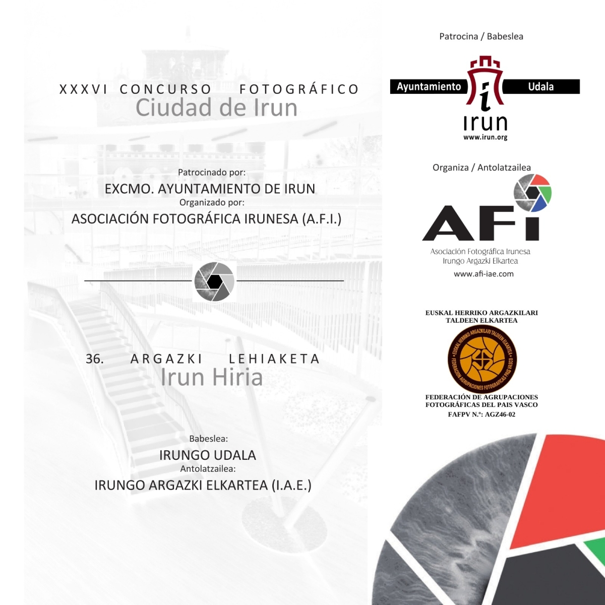 La Asociación Fotográfica Irunesa (AFI-IAE), convoca la 36ª edición del Concurso Fotográfico "Ciudad de Irun", con dos temas: A) Libre y B) Irun.